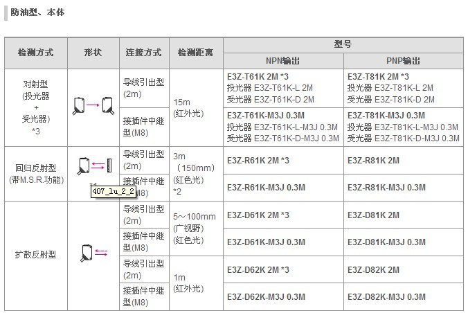 歐姆龍光電傳感器(光電開關(guān))E3Z系列產(chǎn)品參數(shù):